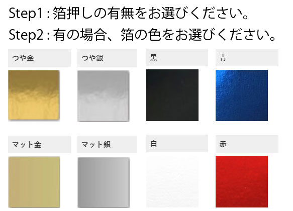 箔押しをご希望の方は、箔押しのカラーをお選びください。カラーによる値段の相違はありません。